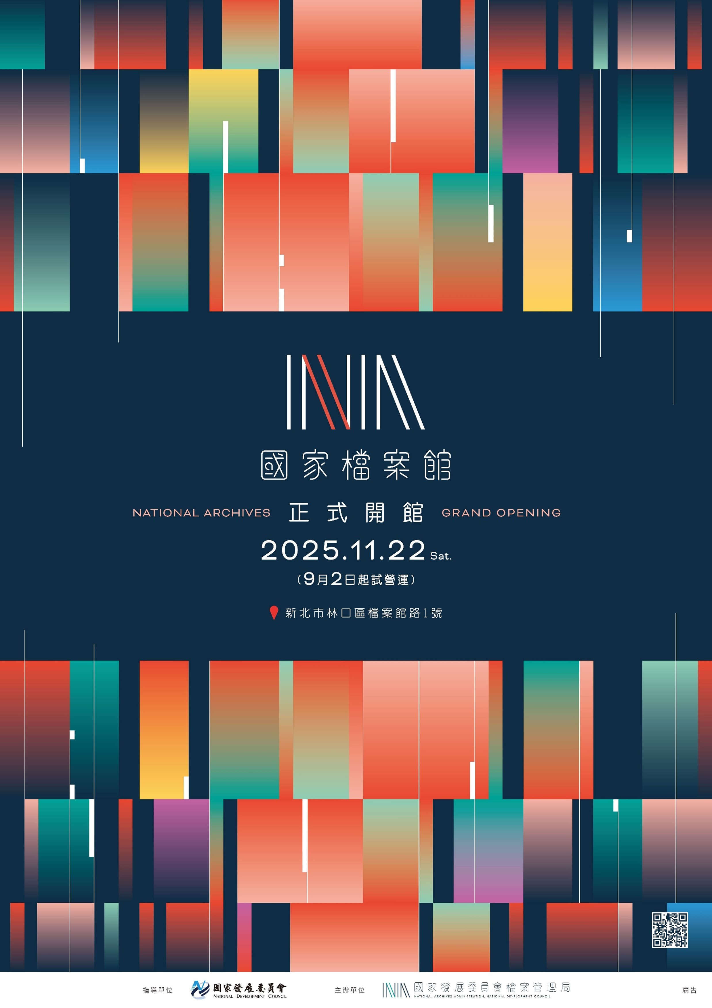 一、國家檔案館整合行政、典藏及多元服務功能,著重發揮智慧營運、技術研發、展示體驗、應用研究、教育推廣及人文休憩等特色,開放全民便捷近用檔案,以創造國家智慧資產價值。 二、館址位於新北市林口區檔案館路1號,開放時間為每週二至週六上午9時至下午5時(週日、週一、國定假日及連續假日休館),免門票參觀,詳請參見檔案局官網(https://www.archives.gov.tw/)。